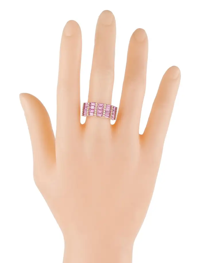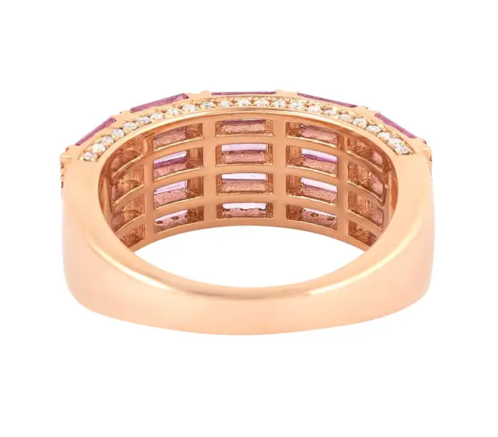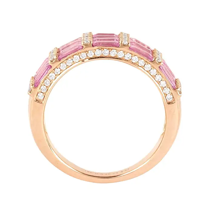 这枚华丽的半永恒戒指镶嵌着2.51克拉的粉红蓝宝石,以及0.40克拉的钻石。色彩缤纷的蓝宝石与璀璨夺目的钻石相得益彰,无论从哪个角度看都熠熠生辉。无论是庆祝订婚、生日,还是仅仅表达爱意,这枚戒指都堪称绝佳之选,复古风情更经久不衰。