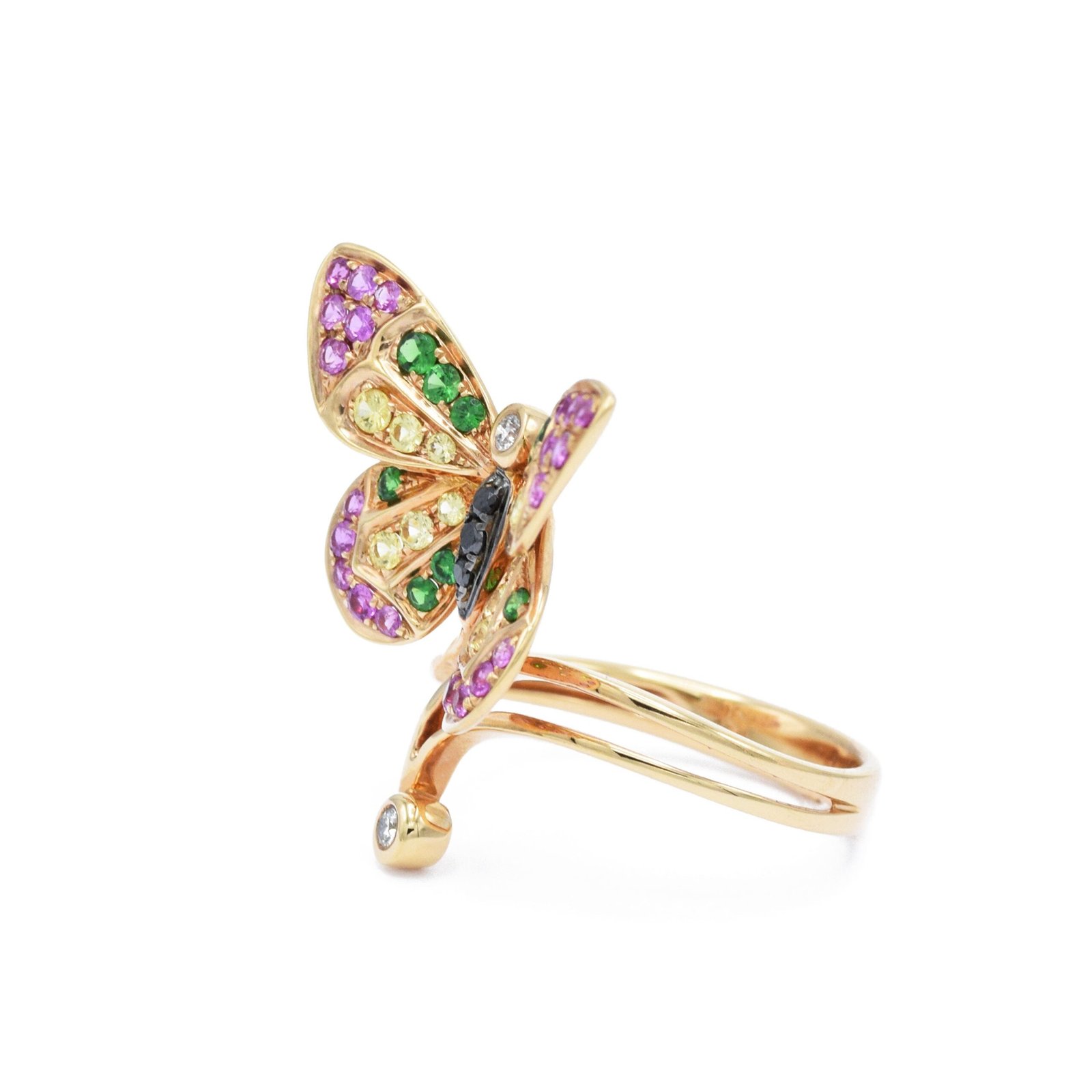 这枚可爱的戒指具有精心设计的蝴蝶形状,由蓝宝石制成,并以 14K 纯金打造。