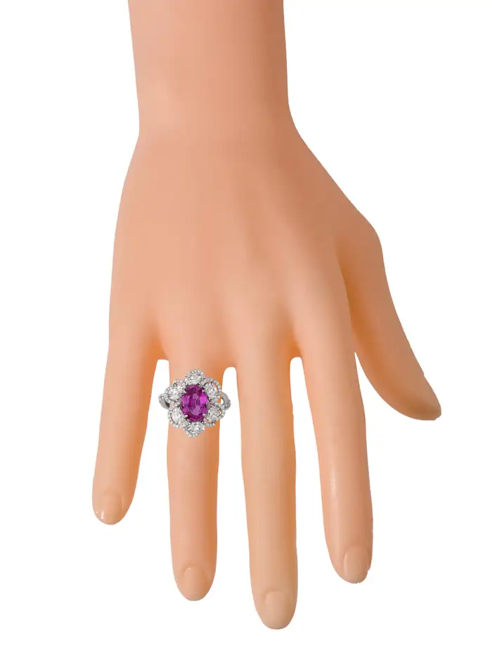 介绍 14K 纯金 3.14 克拉单颗粉红蓝宝石和钻石鸡尾酒戒指 ——这是一件令人惊艳的作品,充满精致与魅力。这枚精美的戒指中央镶嵌着一颗璀璨的粉色蓝宝石,四周环绕着璀璨夺目的钻石,更衬托出戒指的璀璨色彩。