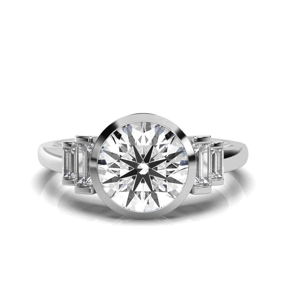 A 2克拉圆形实验室合成钻石光环戒指 与 长方形切割 (0.4克拉) 于 14K 纯金.可选颜色 白金、玫瑰金和黄金. IGI 和 BIS 标记.