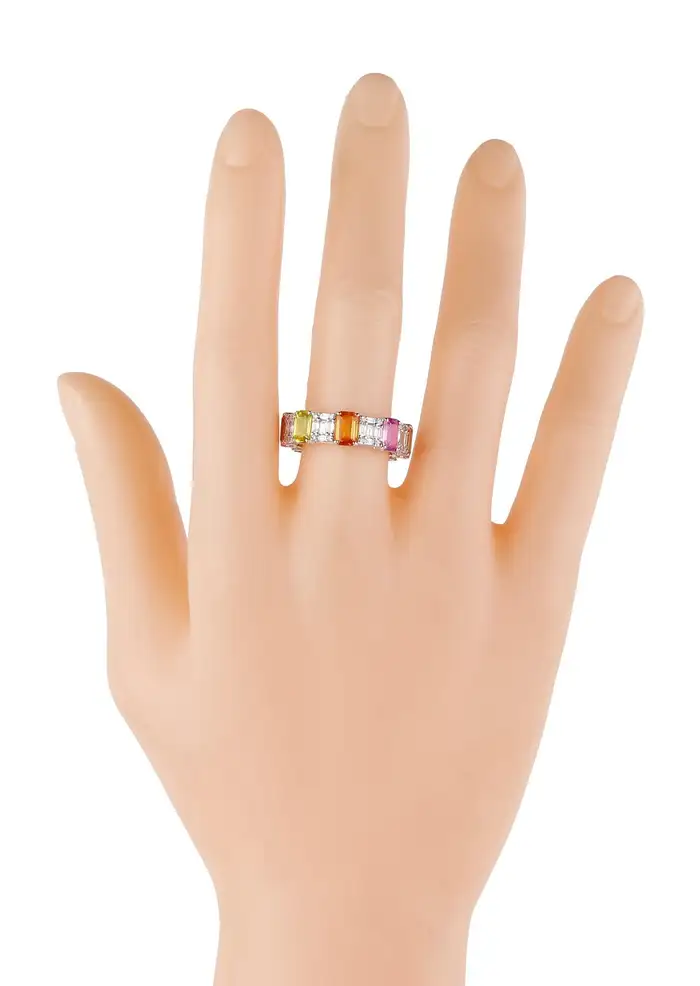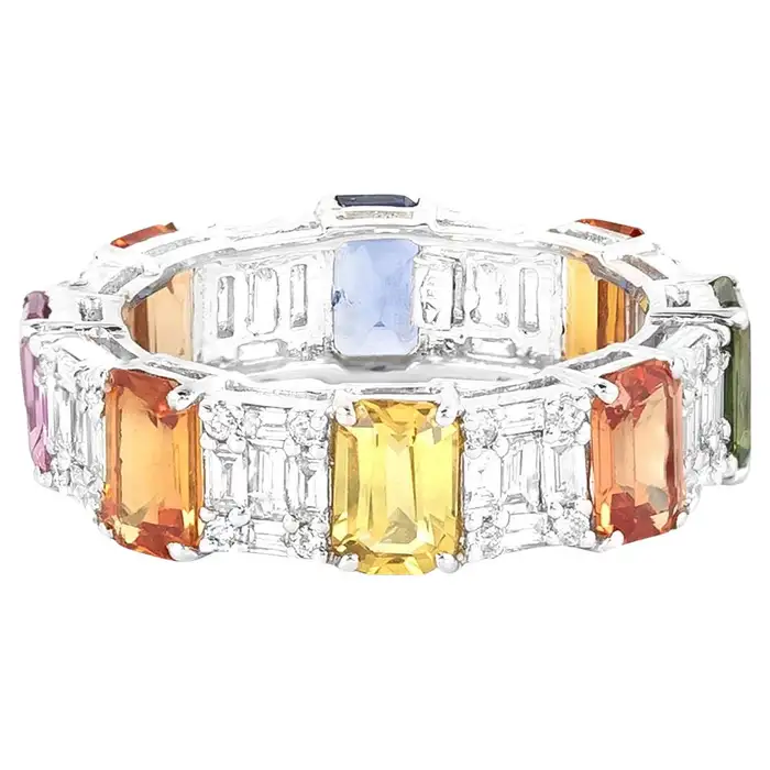令人惊叹的 14K 纯金永恒鸡尾酒戒指,镶嵌着闪闪发光的钻石和多色蓝宝石,设计大胆而充满活力。