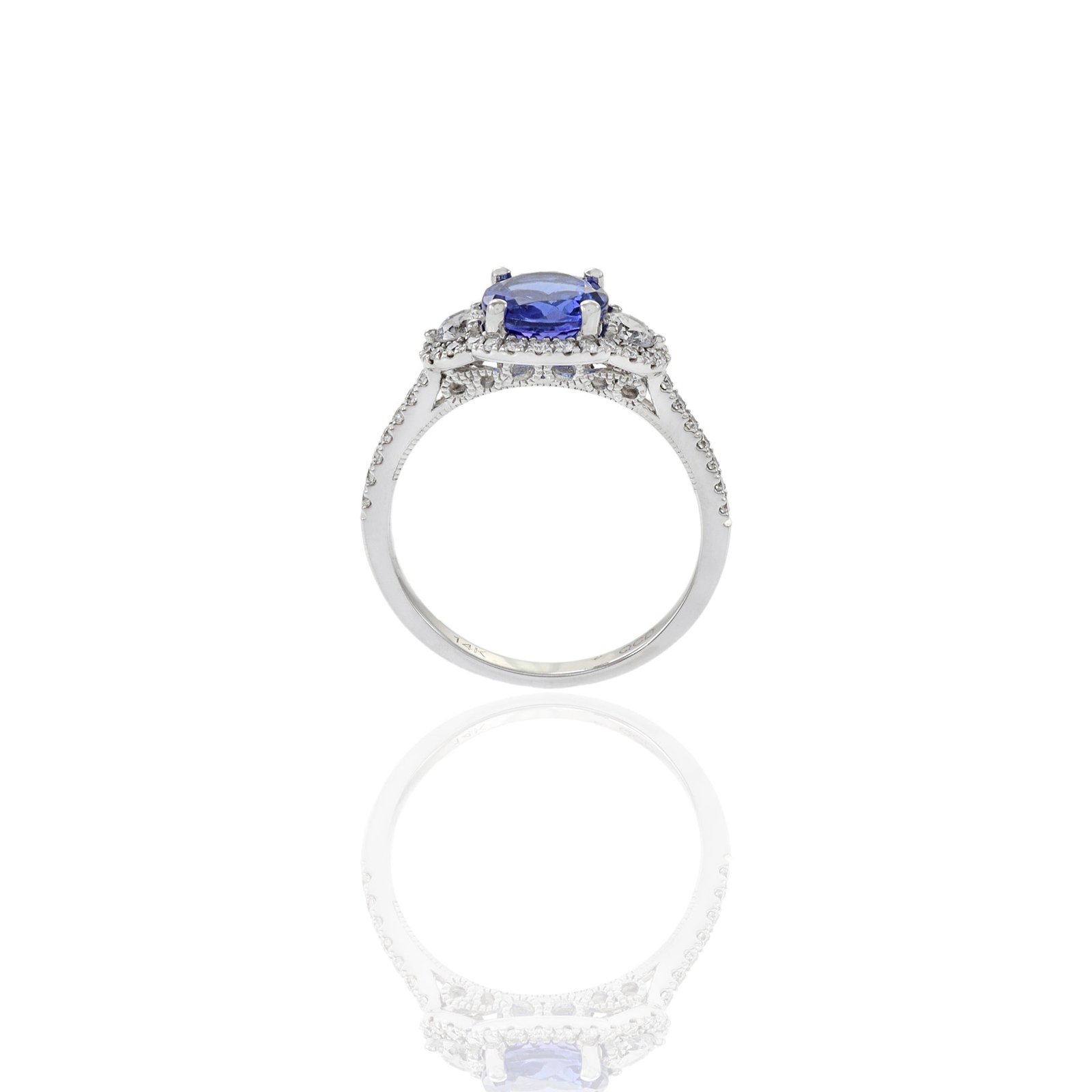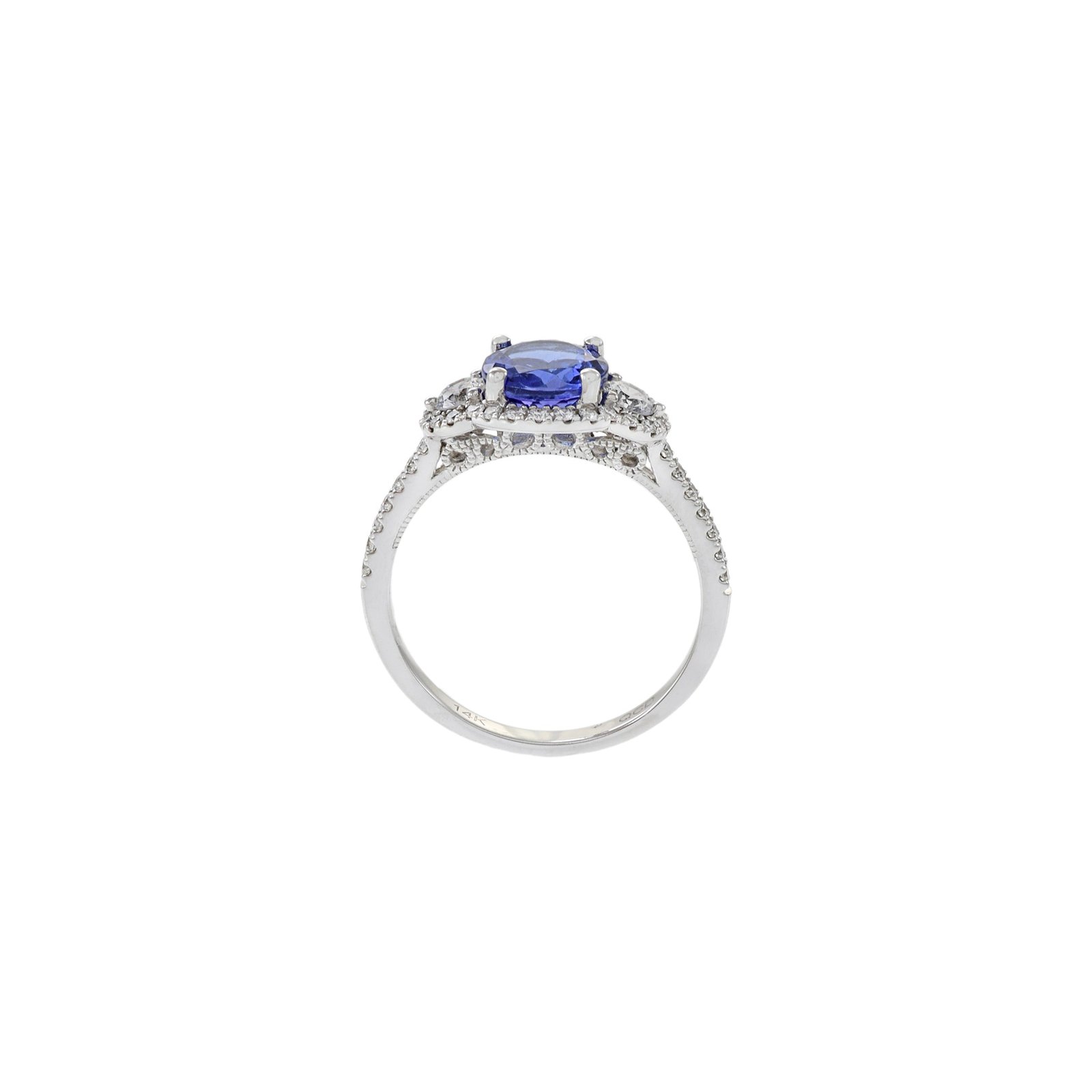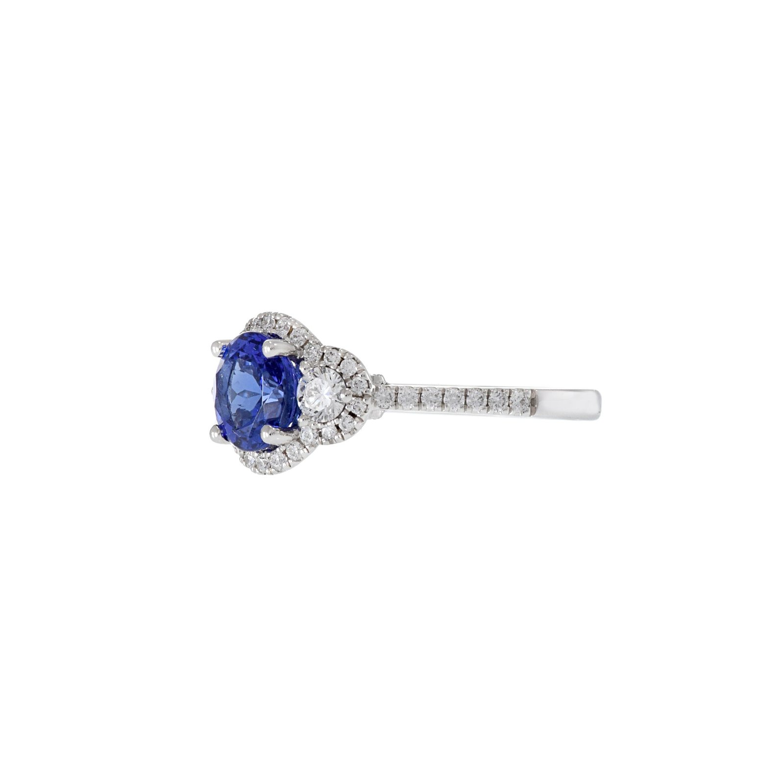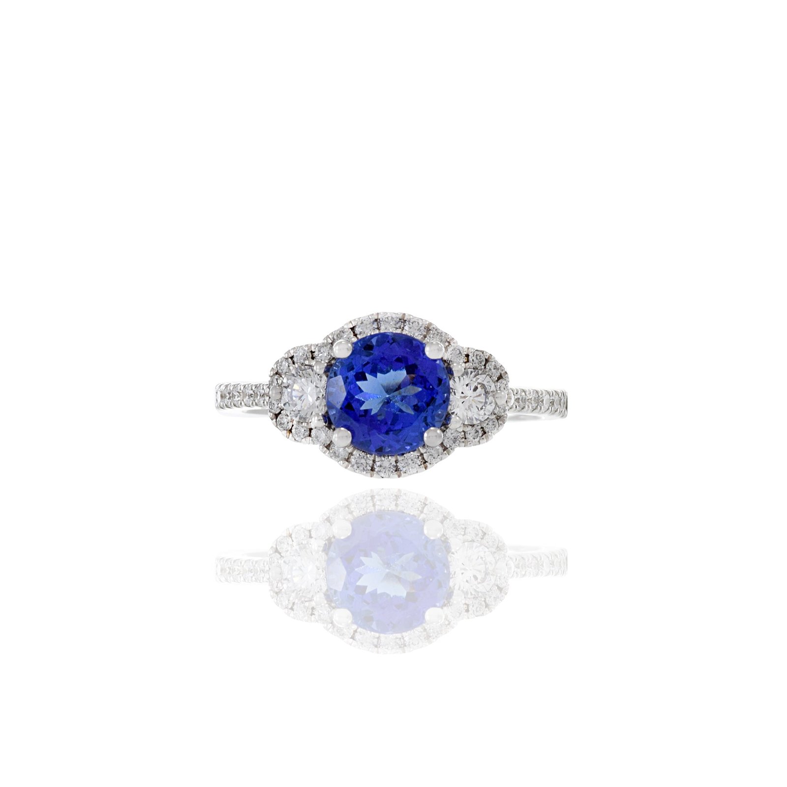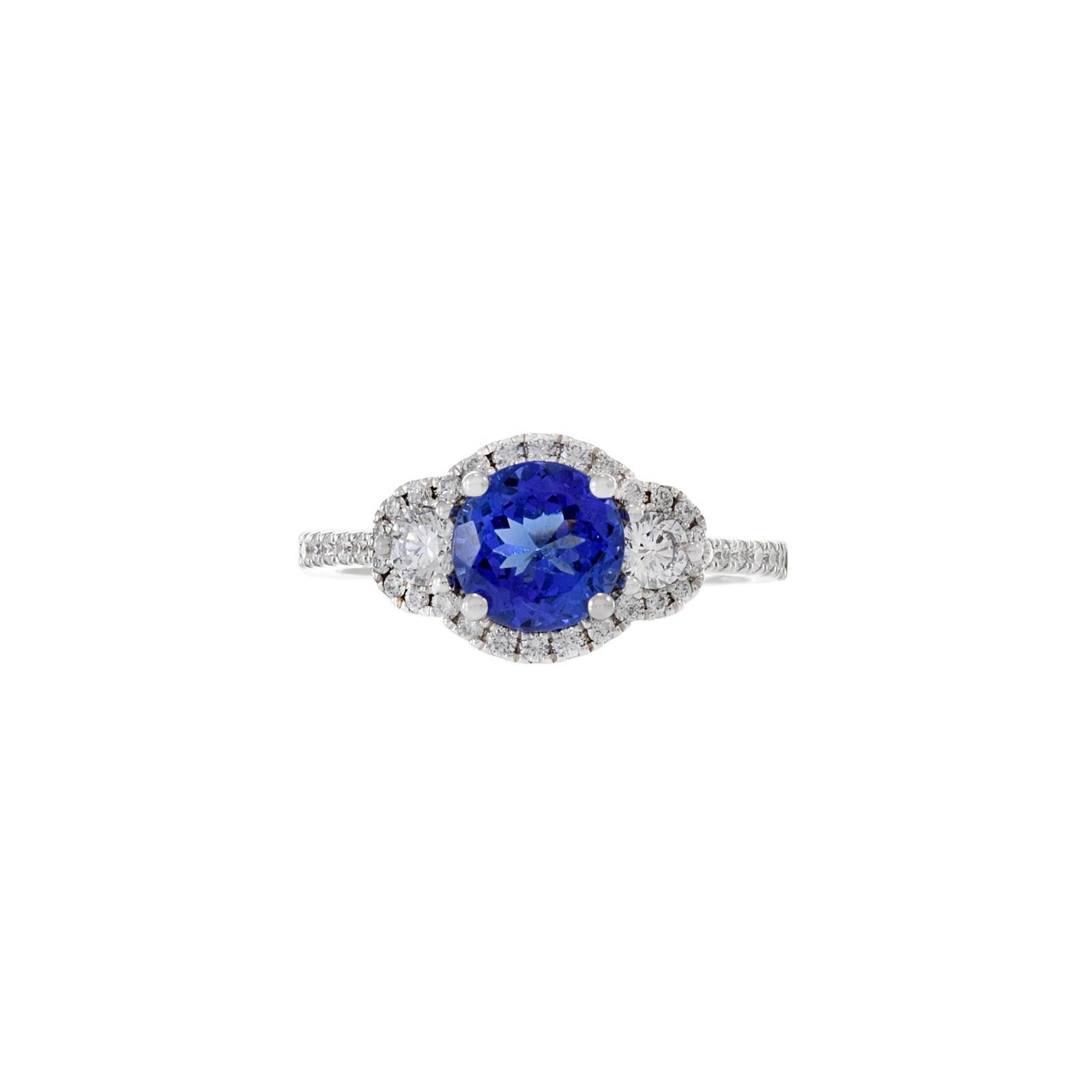 这枚戒指的中心镶嵌着一颗重达1.50克拉的璀璨圆形坦桑石,以其鲜艳的蓝紫色调和非凡的光芒而闻名。坦桑石的绝妙色泽赋予了这枚戒指独特而奢华的气质。