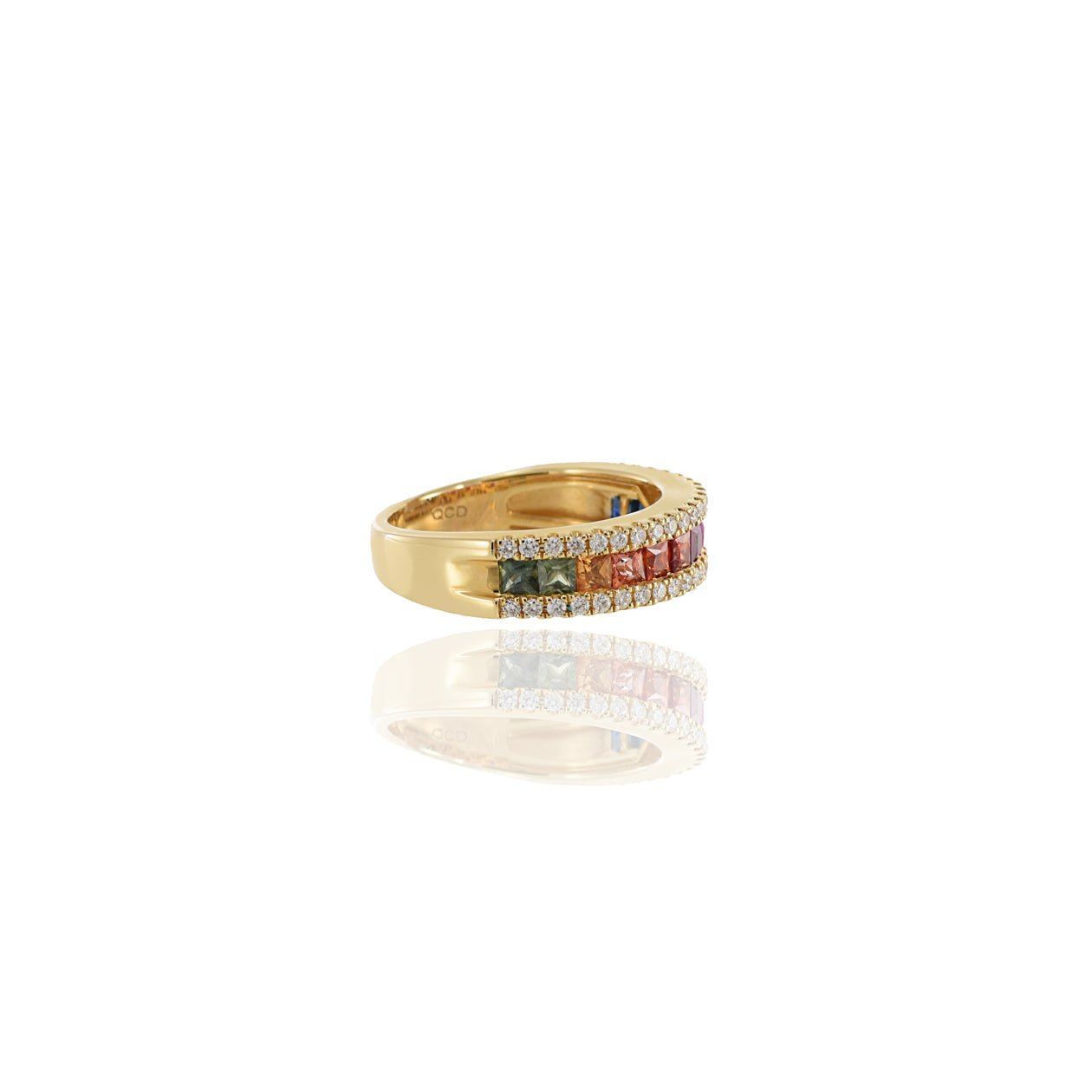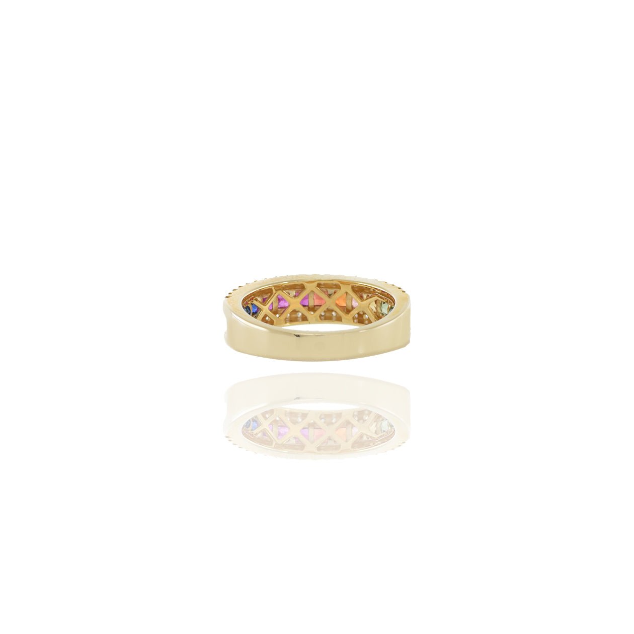 活力四射的 14K 纯金多色蓝宝石和钻石戒环,由美丽的多色蓝宝石和闪耀的钻石组成,设计大胆而优雅。