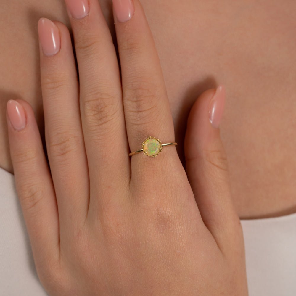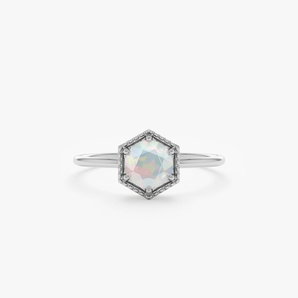 无论您是犒劳自己还是为爱人送上惊喜,我们的六角蛋白石戒指都是爱、美与精致的象征。拥抱天然宝石的魅力,让这枚精致的戒指随着每一个动作而闪耀,提升您的气质。