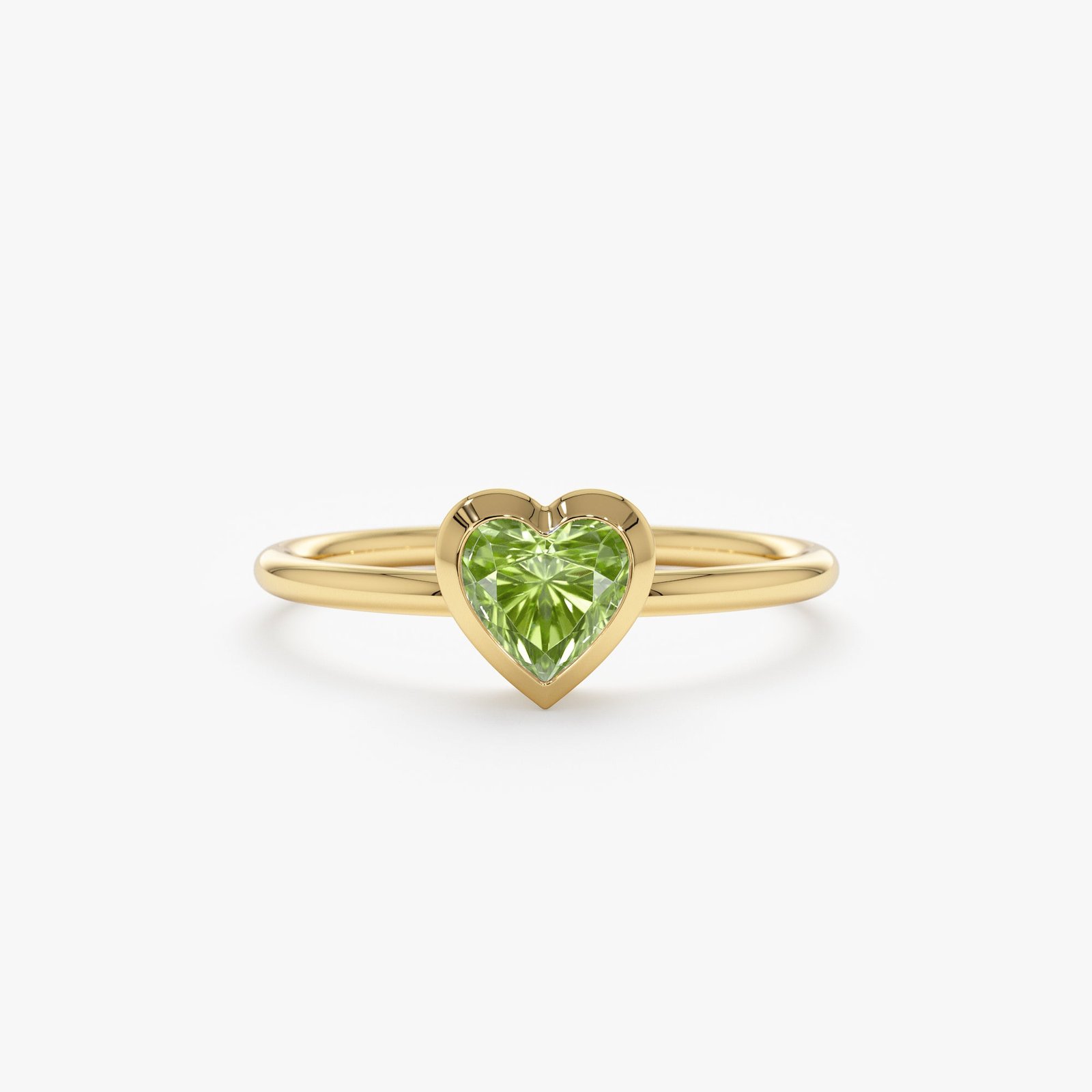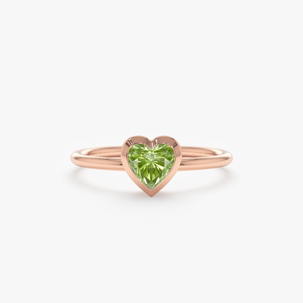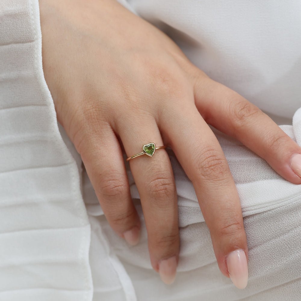 一枚浪漫的 18K 纯金戒指,上面镶有一颗心形橄榄石,设计典雅而充满活力,是任何特殊场合的完美之选。