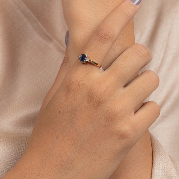 优雅的18K纯金戒指,中央镶嵌一颗璀璨的蓝宝石。经典隽永,无论是特殊场合还是日常优雅造型,都堪称完美。