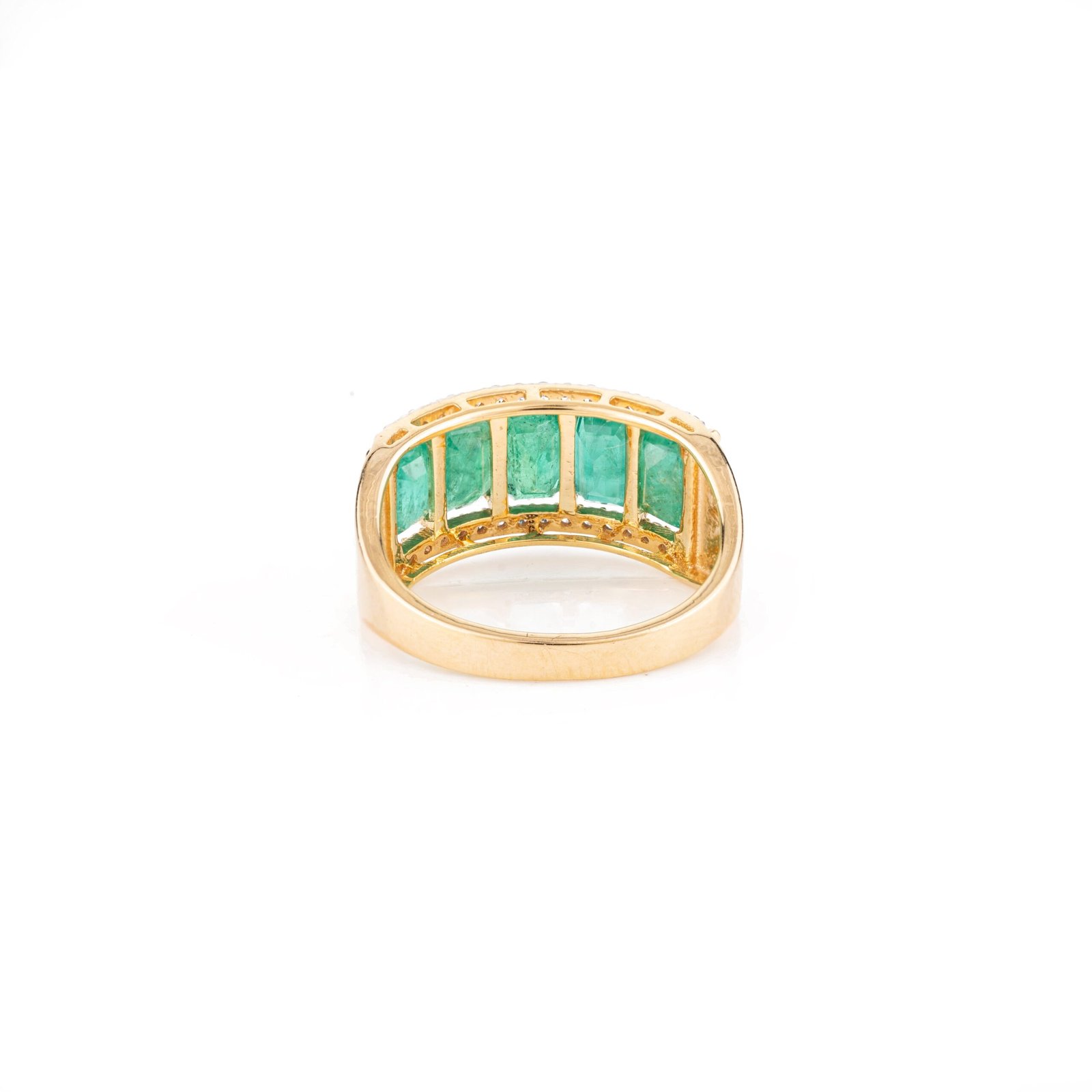 "(《世界人权宣言》) 18k 纯金五石祖母绿钻石订婚戒指 这枚瑰丽的戒指将纯金的隽永优雅与祖母绿的璀璨魅力以及钻石的璀璨光芒完美融合。这款戒指采用18K纯白金打造,镶嵌五颗璀璨夺目的八角形切割祖母绿,每颗尺寸为5.51 x 3.45毫米。这些祖母绿总重3.16克拉,以其浓郁的翠绿和卓越的净度而闻名,是这枚优雅戒指的完美点缀。