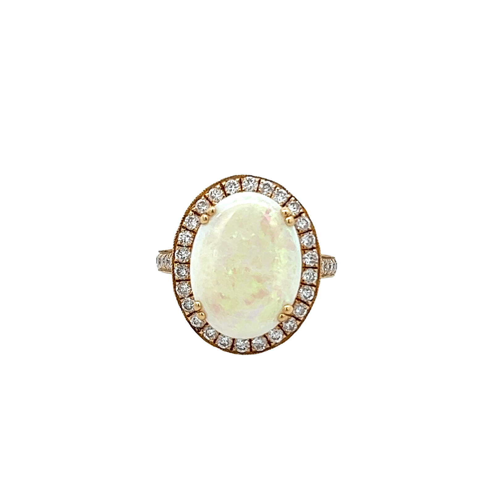 令人惊叹的 18k 纯金圆形切割钻石和蛋白石戒指,以璀璨的蛋白石为中心石,周围环绕着闪闪发光的钻石,显得奢华而优雅。