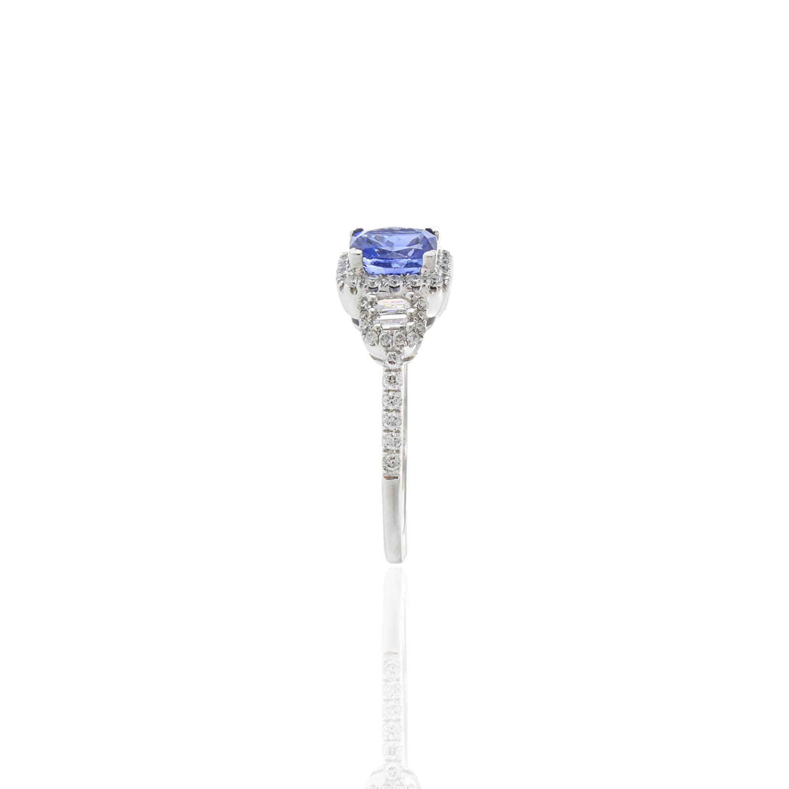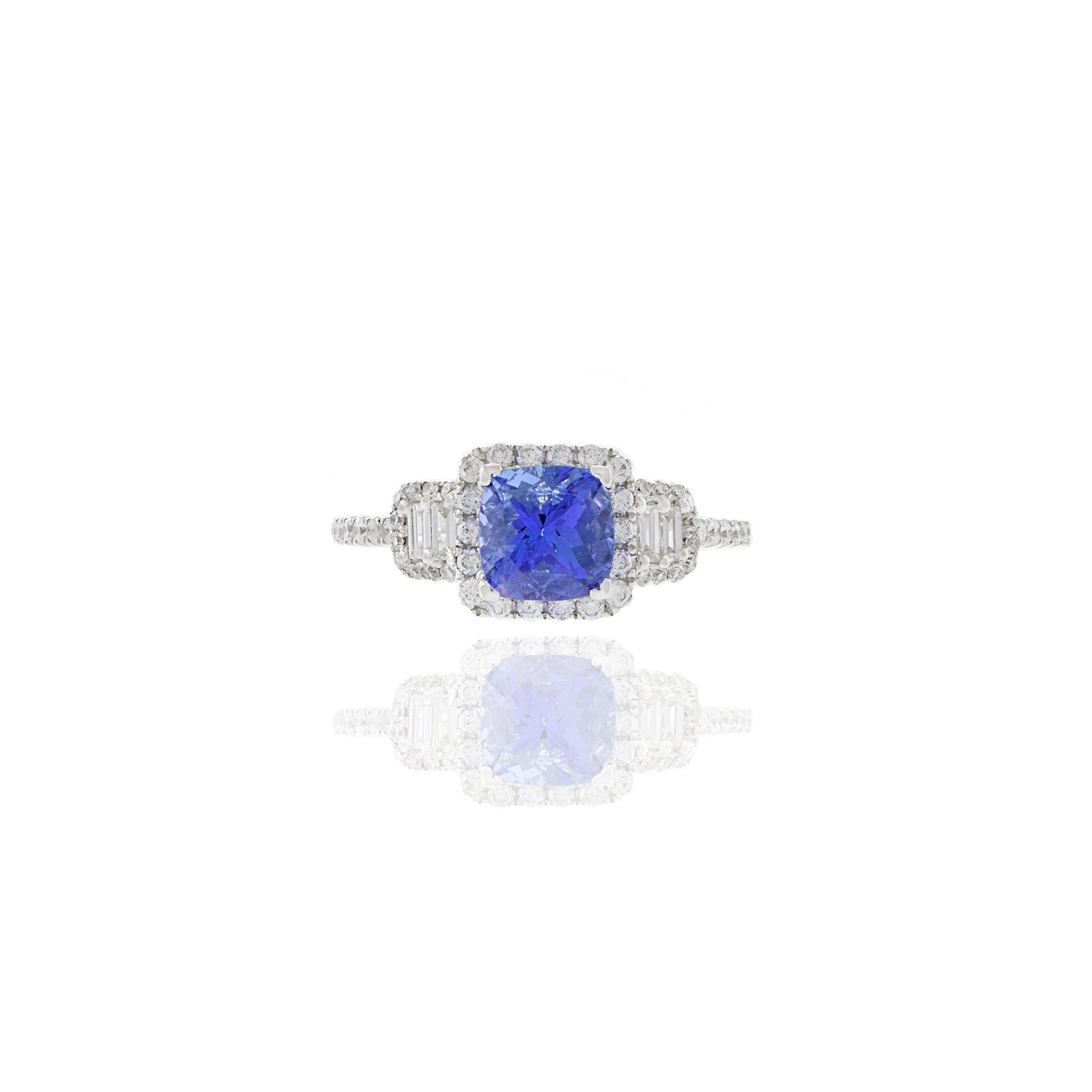 这枚引人注目的戒指上镶嵌着一颗华丽的 1.57 克拉垫形切割坦桑石,镶嵌在光泽的 18k 纯金底座上,有白金、玫瑰金和黄金可供选择。