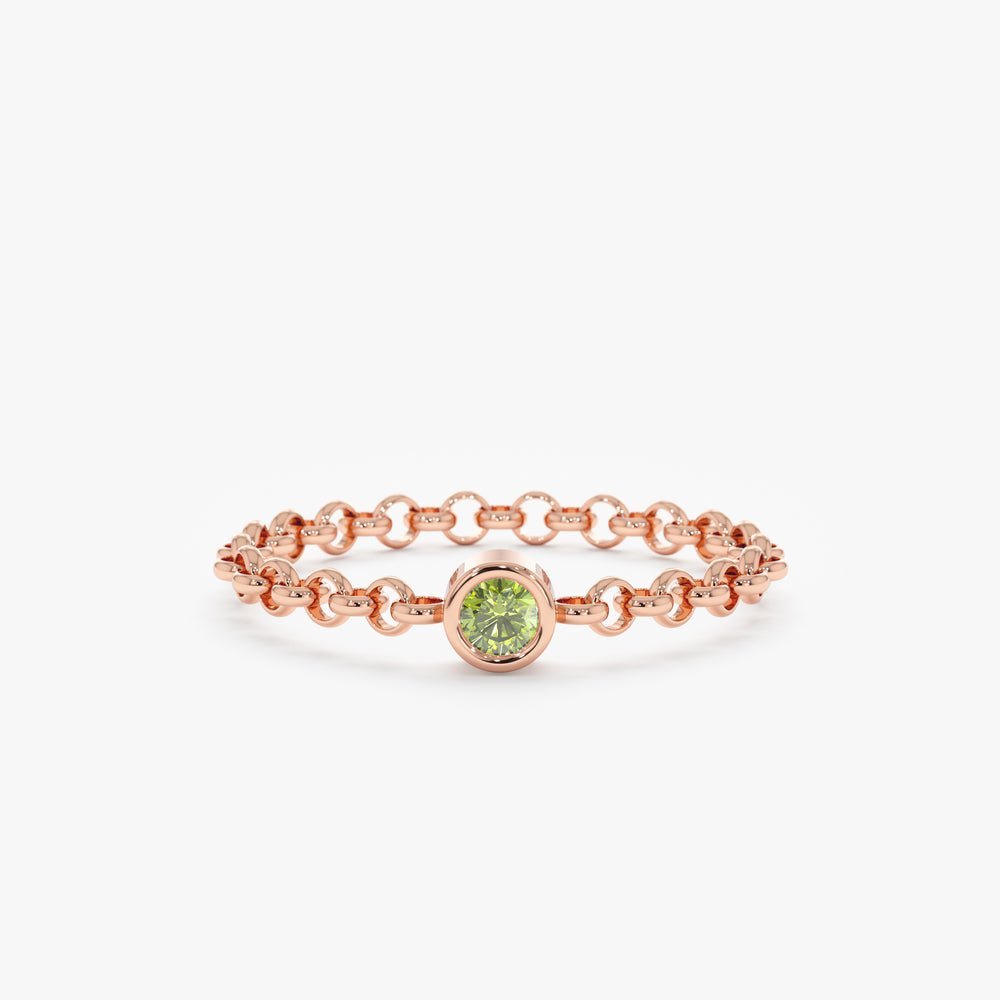 用我们这款充满活力的橄榄石链式戒指,为您的叠戴锦上添花。这款精致的戒指由手工精心打造,细节之处一丝不苟,纤细的纯金链条上镶嵌着一颗天然橄榄石宝石。