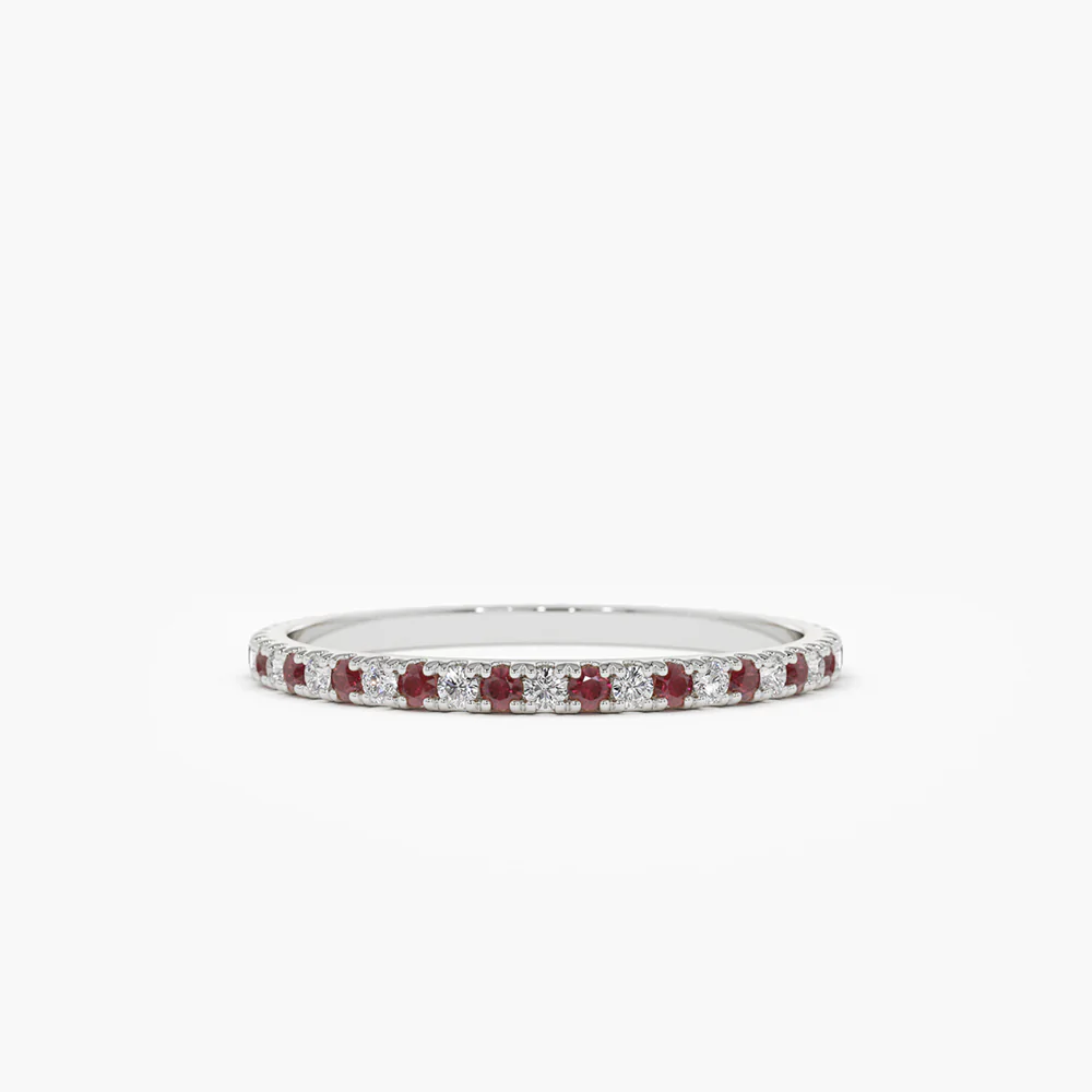 这枚永恒戒指以圆形钻石和圆形红宝石交错排列的精美图案为特色。每种款式共镶嵌24颗钻石,直径1.15毫米。钻石均为手工挑选,颜色等级为G级,净度等级为SI级,闪耀夺目,与红宝石的浓郁红色完美融合。钻石总重约0.15克拉,赋予戒指微妙而夺目的光泽。