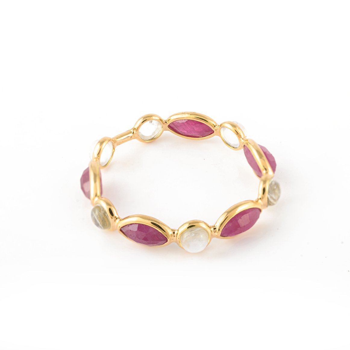 别致的 18k 纯金永恒戒指,交替镶嵌红宝石和彩虹月光石——充满活力的优雅和神秘的美丽。
