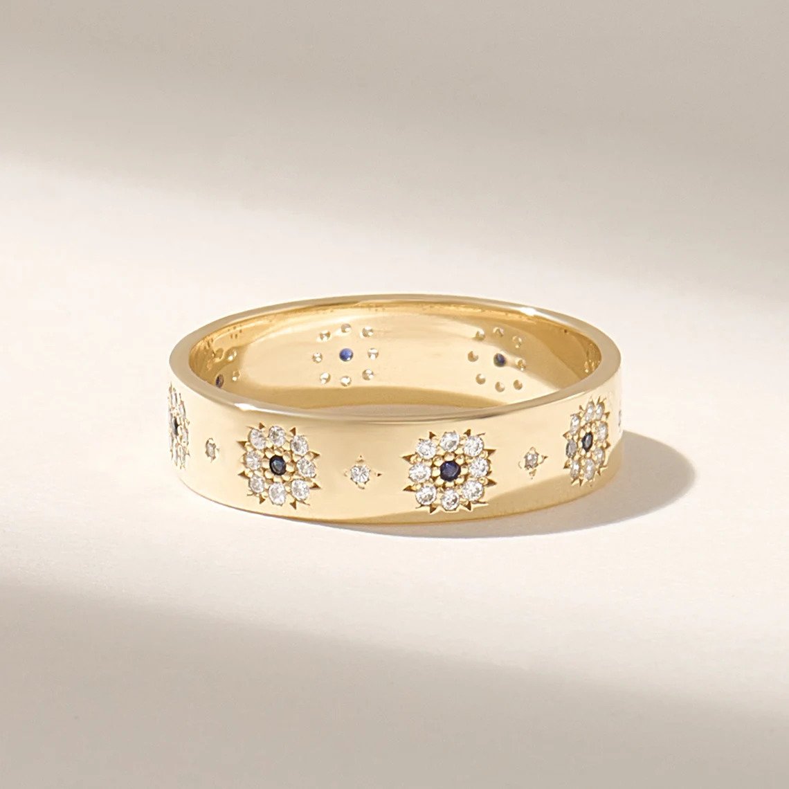 精致的 18k 纯金戒指,镶嵌有花卉图案的鲜艳蓝宝石,为任何珠宝系列增添永恒而优雅的气息。