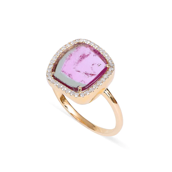 一枚令人惊叹的 18k 纯金戒指,镶有切片西瓜碧玺,周围环绕着闪闪发光的钻石,设计充满活力和优雅。